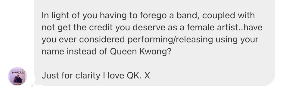 The second question is from about my feelings around releasing music under my name rather than “Queen Kwong.”