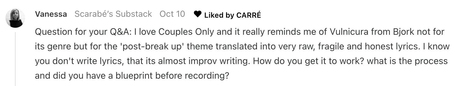 Anyway, it took me a while to go through all of the questions you sent, but I really appreciate the curiosity shown. I was surprised by how many of you wanted to know more about my songwriting process. Talking about it sometimes feels tedious and self-indulgent—like talking about yourself often does—but thanks for reminding me that it's still of interest to you. I was also taken aback by the hilarious questions you sent wanting my advice on dating musicians. So much so that I may need to make my own column dedicated to this topic. But to make a long story short: Is it a good idea to date a musician? Absolutely not.